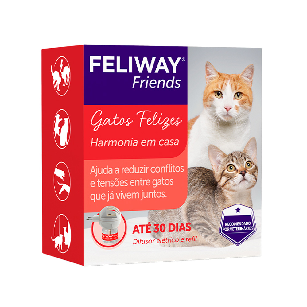 Indicado especialmente para casas com mais de um gato, o Feliway Friends auxilia na diminuição de brigas, perseguições, bloqueio de passagem, rosnados e comportamentos agressivos, sem causar sedação ou alteração de personalidade. Basta conectar o difusor na tomada para que o feromônio seja liberado continuamente no ambiente, criando uma atmosfera mais calma e equilibrada.