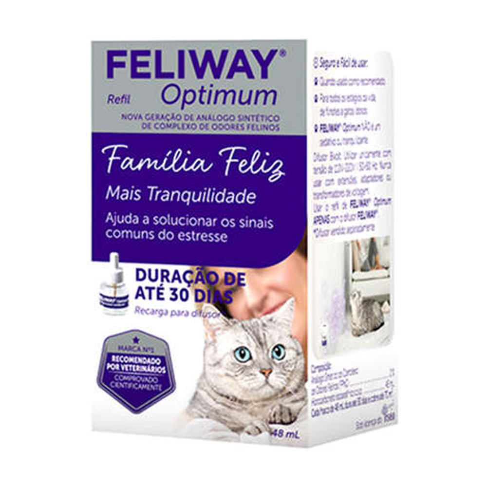 O Feliway Optimum Refil 48ml é a reposição ideal para o seu difusor Feliway Optimum. Desenvolvido com uma combinação avançada de feromônios, este produto é projetado para proporcionar um ambiente mais tranquilo e harmonioso para os gatos. O Feliway Optimum ajuda a reduzir comportamentos relacionados ao estresse, como marcação territorial, arranhões excessivos e brigas entre gatos.